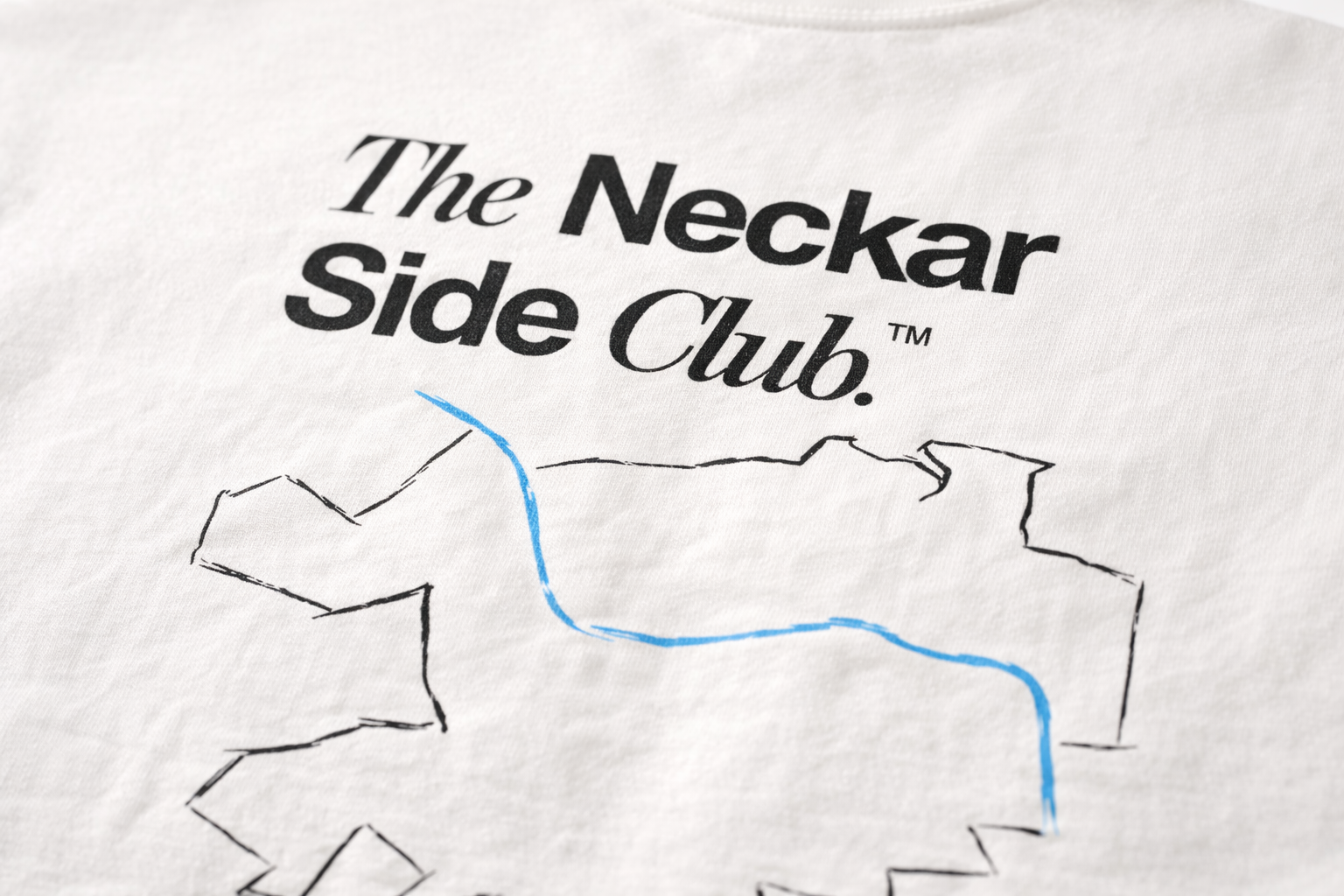 Das Neckar Side Club Motiv verbindet Typografie und Linie zu einer stillen Hommage an das Leben am Fluss. Lokal gedruckt auf hochwertiger, off-white Baumwolle.